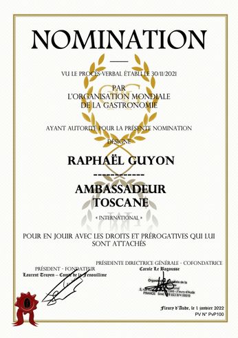 Nomination comme Ambassadeur Toscane pour l'Organisation Mondiale de la Gastronomie (L'O.M.G.)
